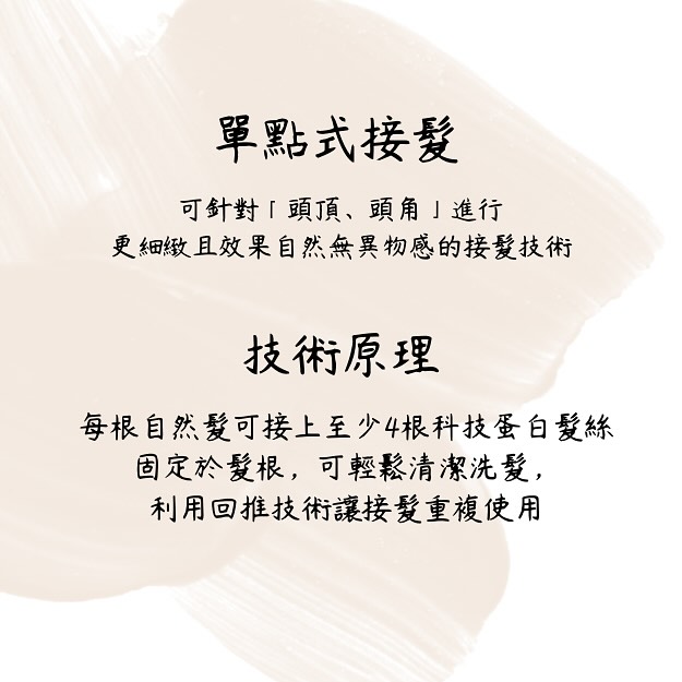 單點式接髮不需打結、不需接片, 每一根真髮可接上 2–4 根科技蛋白髮絲, 技術點極小、重量輕, 配戴時幾乎無感。